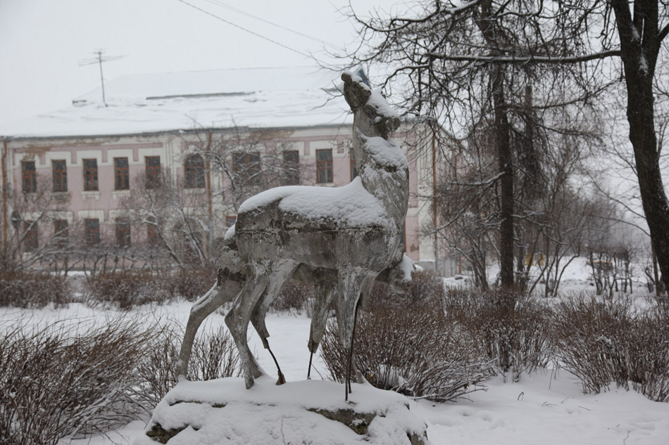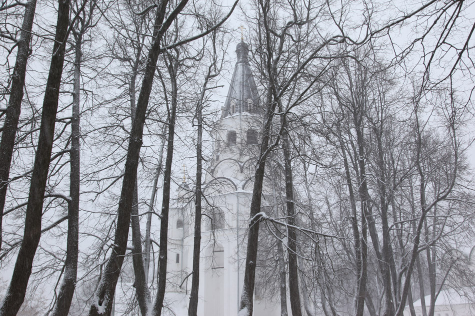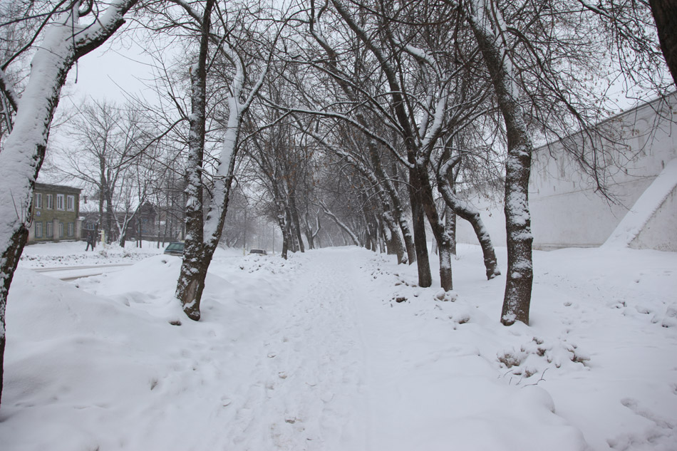 Однодневная вылазка в Александров совпала с началом невероятного снегопада. Мелкий снежок начал падать ещё с утра, а по прибытии электрички в пункт назначения снег валил сплошной стеной. Я даже не рисковал вынимать камеру, но первой проверке на погодные условия ей всё же пришлось подвергнуться. Правда, куча интересных моментов осталась не запечатлена, так как выгадать более или менее удачный момент, когда снегопад чуть стих, удалось уже ближе к концу прогулки — в местном Кремле.