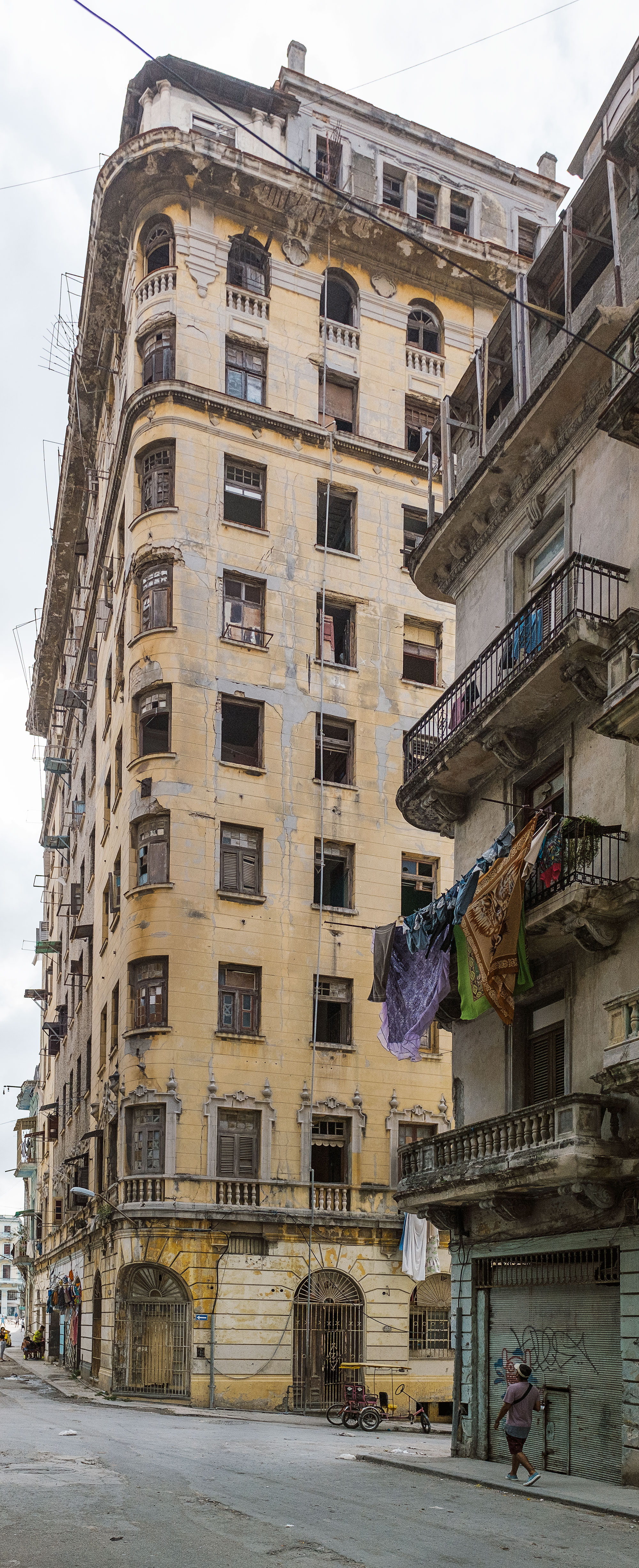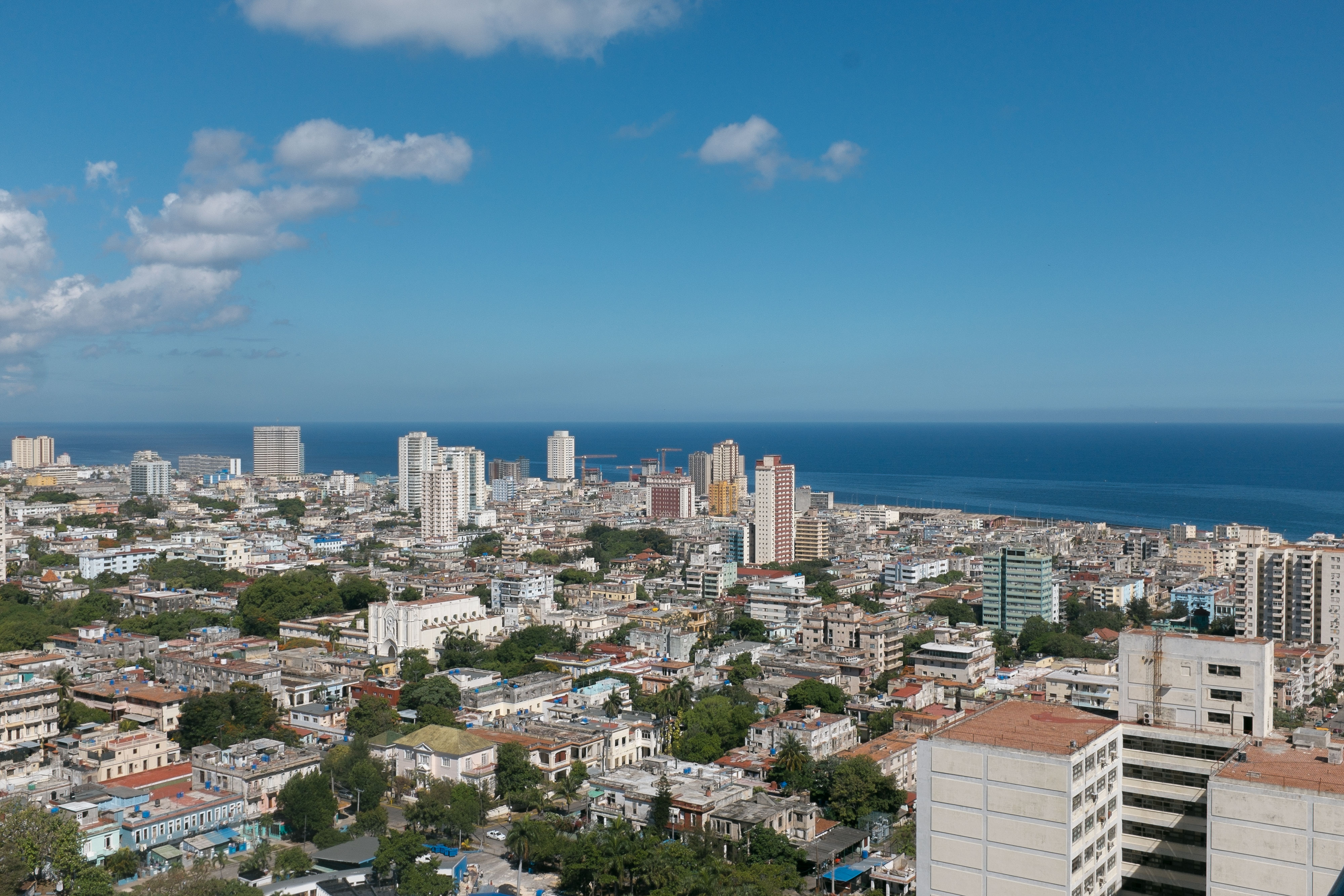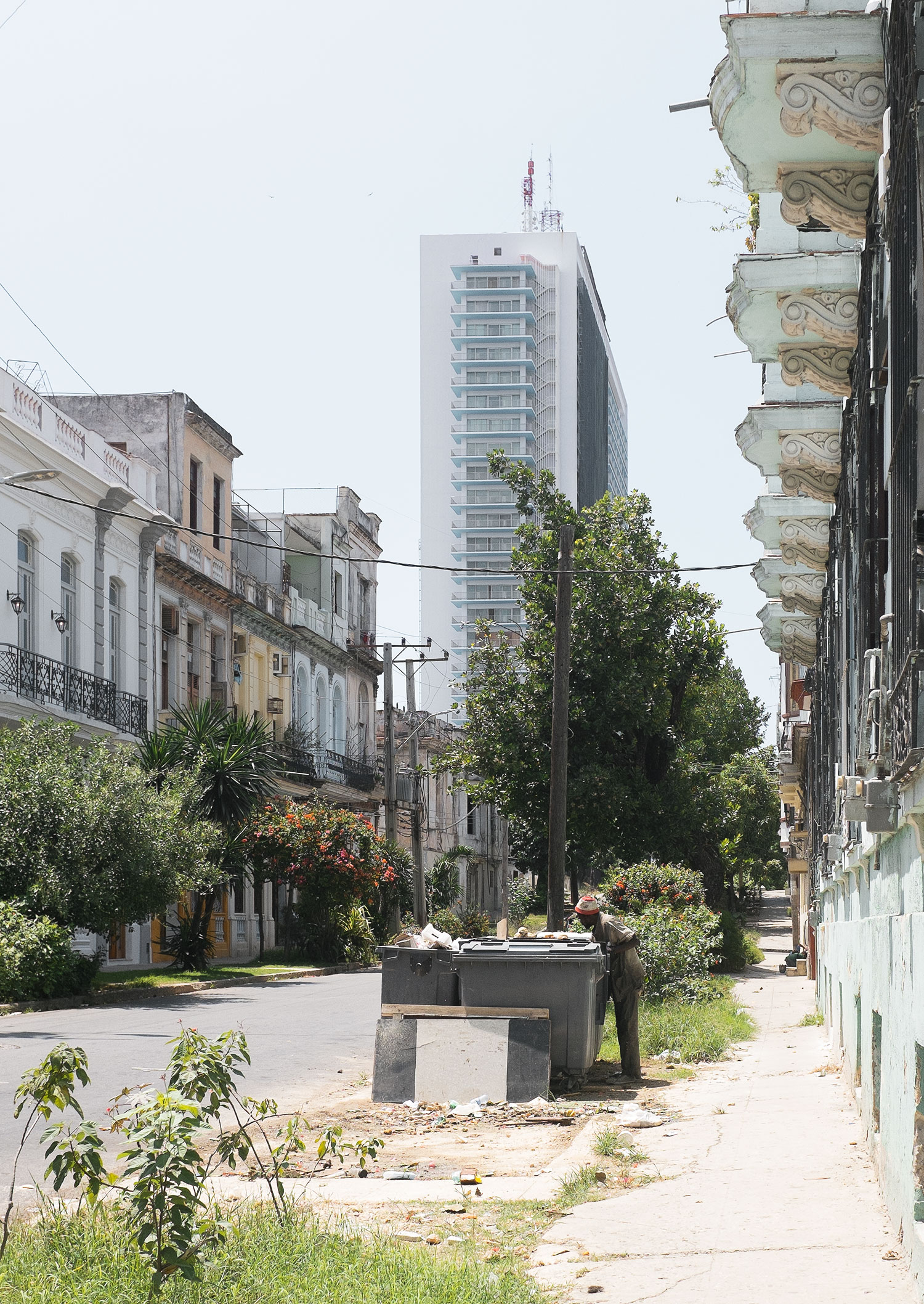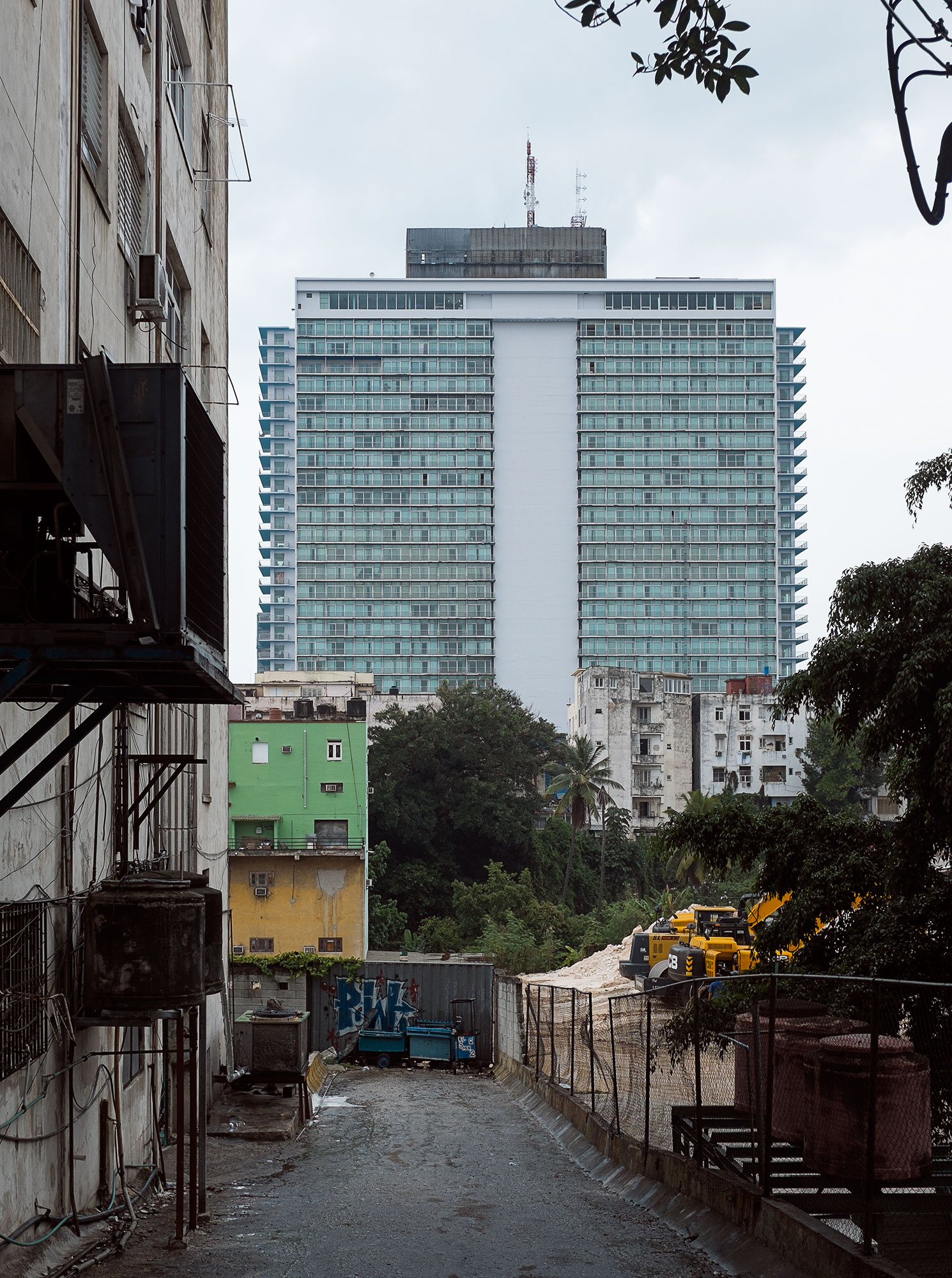 Я жил в гостинице «Куба Либре», весьма интересной в архитектурном плане. Некогда самое высокое здание в Латинской Америке видно издалека. Оно возвышается над городом, так что его сложно не заметить. Я не мог поверить, что кубинцы, пусть даже с советской помощью, могли бы построить такой современный отель. Однажды я гулял по атриуму второго этажа и наткнулся на фотоисторию отеля. Оказалось, он был построен Хилтоном за год до революции. На первых фотографиях было множество знаменитостей, торжественное открытие кубинского отеля, улыбающиеся постояльцы. Следующие фотографии ознаменовали иную веху — бородатые вооруженные повстанцы в зеленых формах вальяжно валяются в креслах разоренного отеля. Сейчас просторные номера выглядят пусто и скромно. На некоторые этажи, кажется, вовсе не заселяют — там темно и с потолков свисают провода.