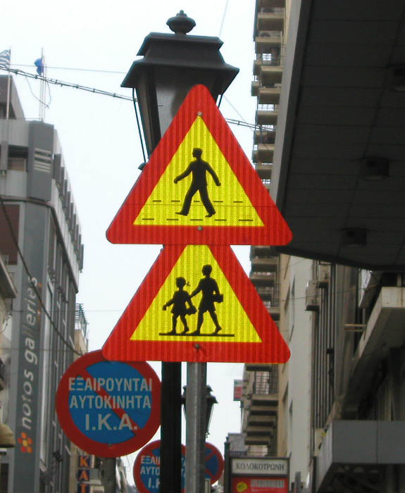 Обратил внимание, что греческие «Осторожно, дети!» не перебегают дорогу, размахивая руками, а стоят как на параде, держа учебники в руках. А пешеход выше ассоциируется у меня с гипнотическим воздействием.