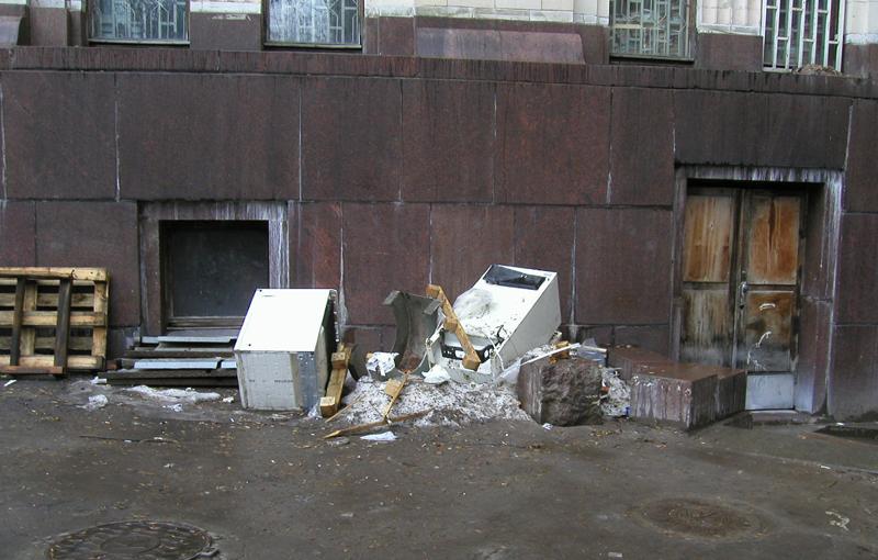 Ну и в-третьих, у стены притаилась кучка битой бытовой техники. Учитывая её состояние, родилось предположение, что летела она непосредственно из окон. Я проверил да, в окно такой холодильник пролез бы. При снежном покрове такой светлый мусор вряд ли особо выделялся, но сейчас вы сами прекрасно наблюдаете несовместимость данного хлама и окружающей загаженной местности.